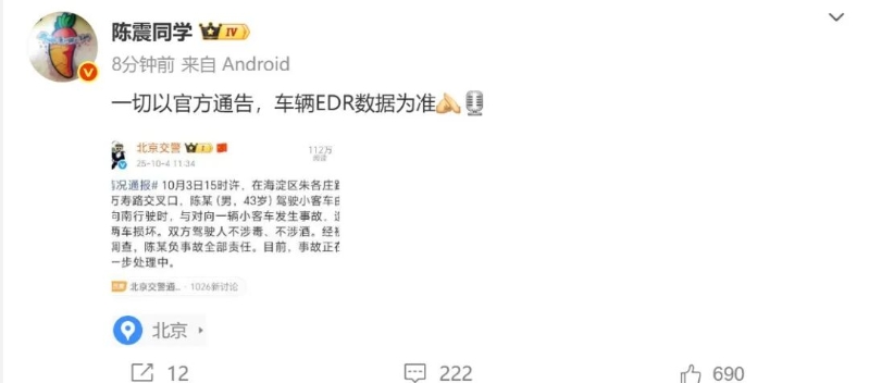 10月4日,知名車評人陳震就“勞斯萊斯車禍”一事發文致歉: