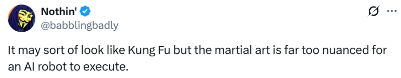 但也有網友表示,“這看起來或許有點像功夫,但武術的精妙程度遠非AI機器人所能掌握?!?/p>