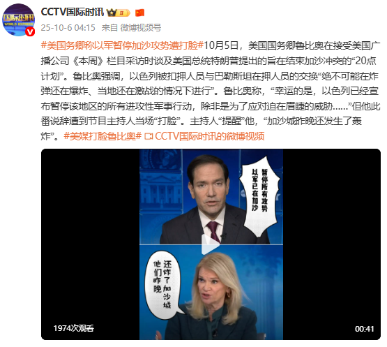 10月5日,美國國務卿魯比奧在接受美國廣播公司《本周》欄目采訪時談及美國總統特朗普提出的旨在結束加沙沖突的“20點計劃”。魯比奧強調,以色列被扣押人員與巴勒斯坦在押人員的交換“絕不可能在炸彈還在爆炸、當地還在激戰的情況下進行”。魯比奧稱,“幸運的是,以色列已經宣布暫停該地區的所有進攻性軍事行動,除非是為了應對迫在眉睫的威脅……”但他此番說辭遭到節目主持人當場“打臉”。主持人“提醒”他,“加沙城昨晚還發生了轟炸”。