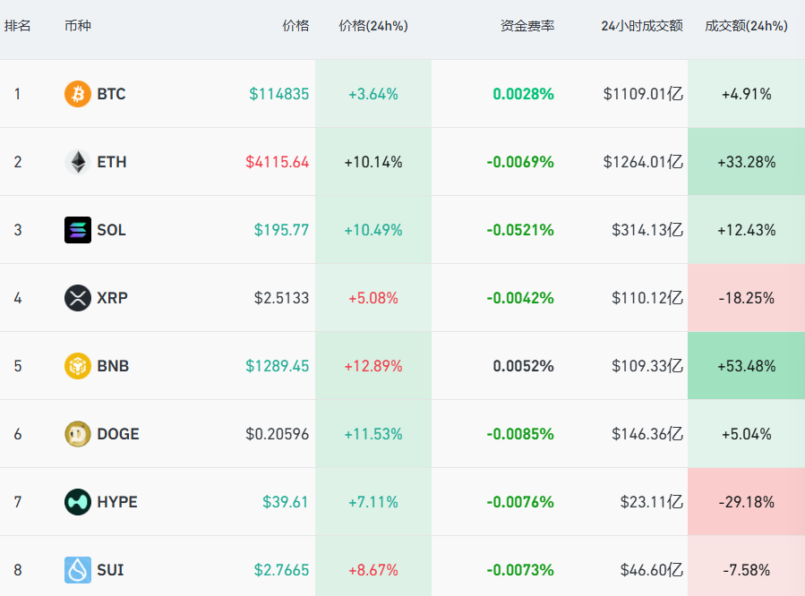 截至13日7時15分,加密貨幣集體上漲。此前一度從12.2萬美元高位跌至10.15萬美元的比特幣,最新報114835美元/枚,以太坊、BNB、XRP、狗狗幣等紛紛跟漲。