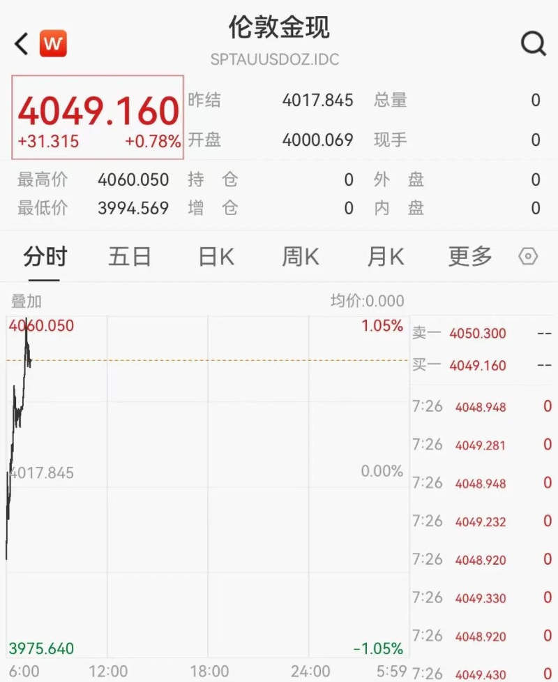 10月13日,現貨黃金開盤快速拉升,一度漲破4060美元,刷歷史新高。截至7時30分左右,漲幅略微收窄,最新報4049.16美元/盎司。