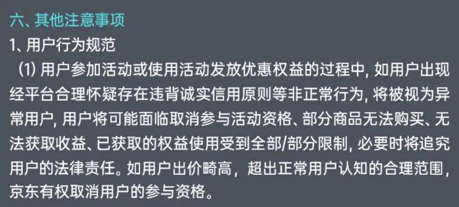 此外,競價成功的用戶會收到短信支付提醒,一小時內仍未提交訂單的用戶將收到電話支付提醒。用戶需要在競價成功后24小時內提交訂單,并在30分鐘內支付貨款,若逾期未提單或逾期未支付,訂單將被取消。若用戶出價畸高,“超出正常用戶認知的合理范圍”,京東有權取消用戶的參與資格。