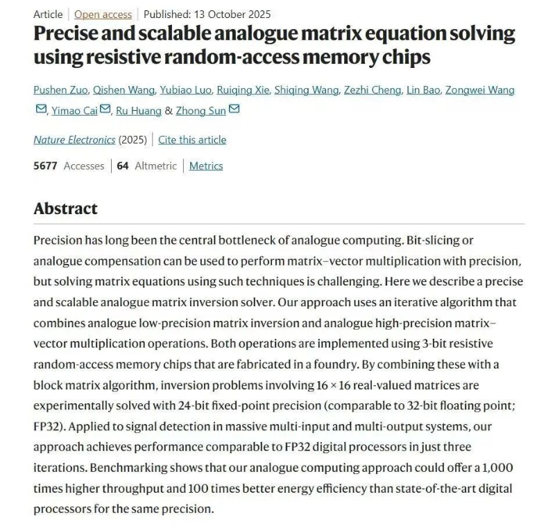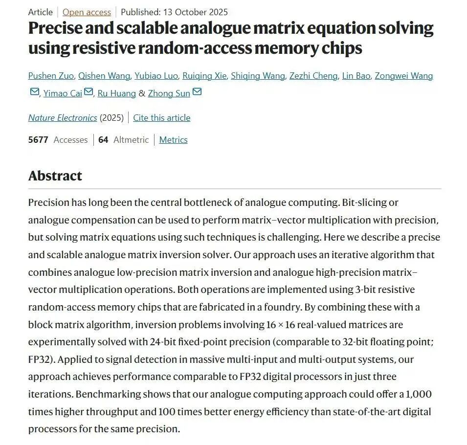 近日,北京大學人工智能研究院孫仲研究員團隊聯合集成電路學院研究團隊,成功研制出基于阻變存儲器的高精度、可擴展模擬矩陣計算芯片,首次實現了在精度上可與數字計算媲美的模擬計算系統。