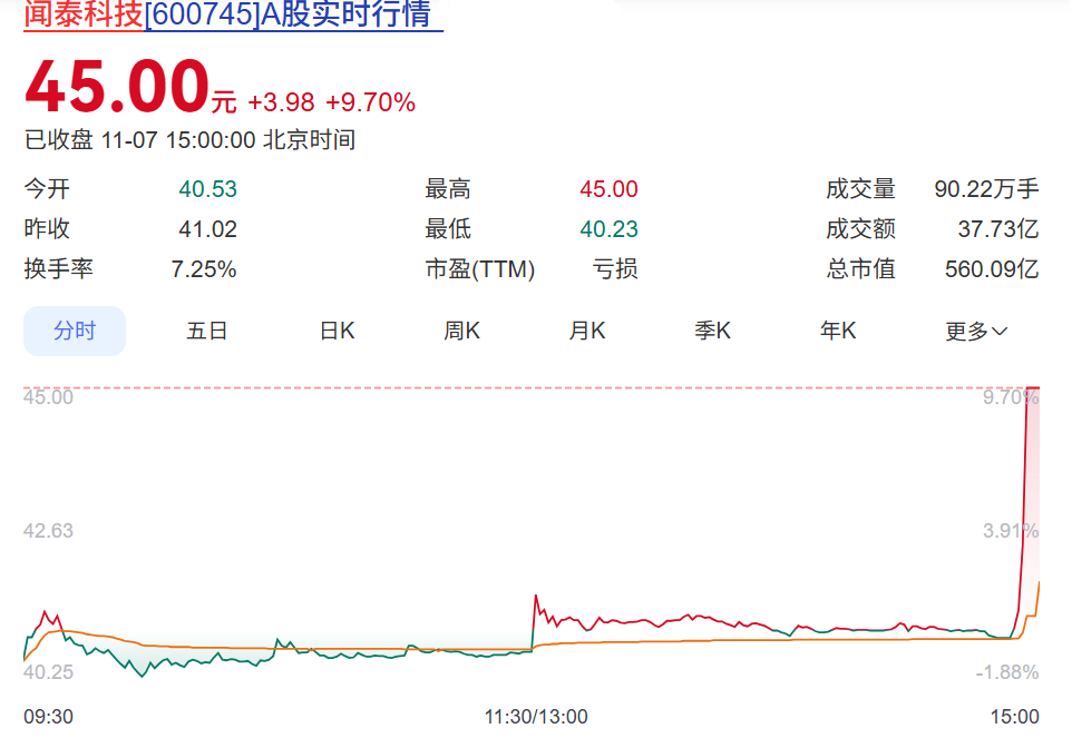 或受此消息影響,11月7日尾盤,聞泰科技(600745.SH)直線拉升逼近漲停,收盤價45元/股,漲幅9.70%。