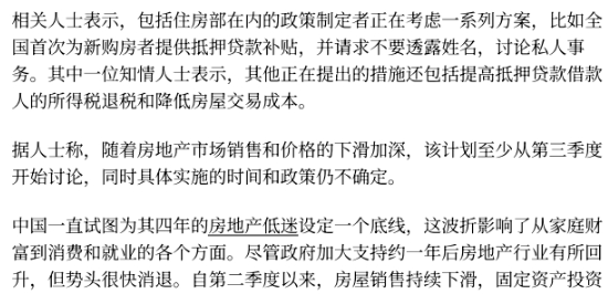 彭博社11月20日發布一篇報道稱,為挽救持續近四年的房地產低迷局面,政策制定者正在考慮推出前所未有的支持方案,其中包括全國層面首次為新購房者提供抵押貸款補貼,并配套提高貸款利息個稅抵扣、降低交易成本等舉措。但是,住房和城鄉建設部未對相關問詢做出回應。